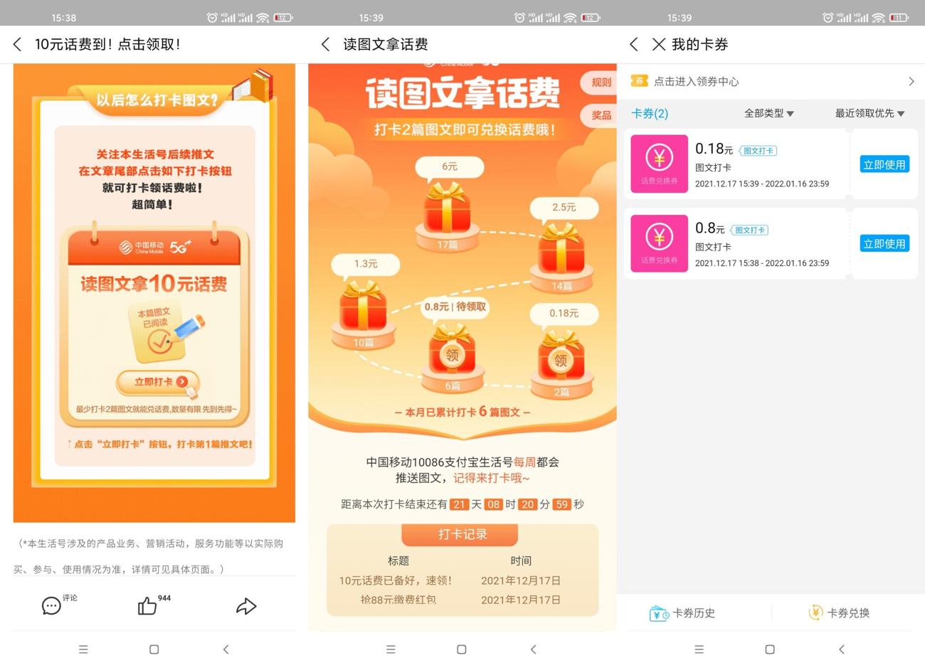 移动打卡领取1.96元话费秒到