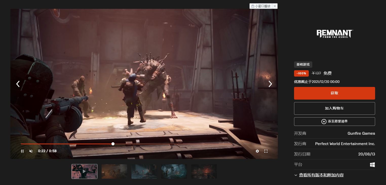 领取地址:https://www.epicgames.com/store/zh-CN/p/remnant-from-the-ashes
