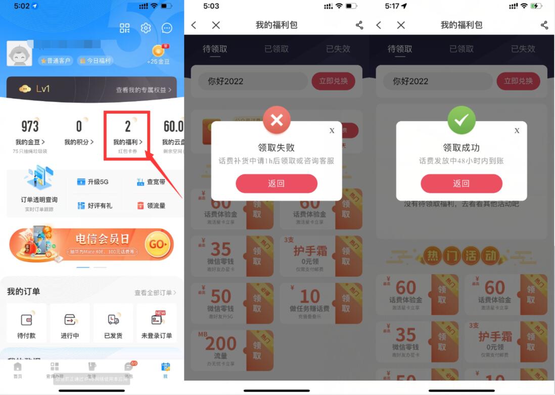打开电信APP->我的福利->输入下面口令->手动兑换领取秒到账