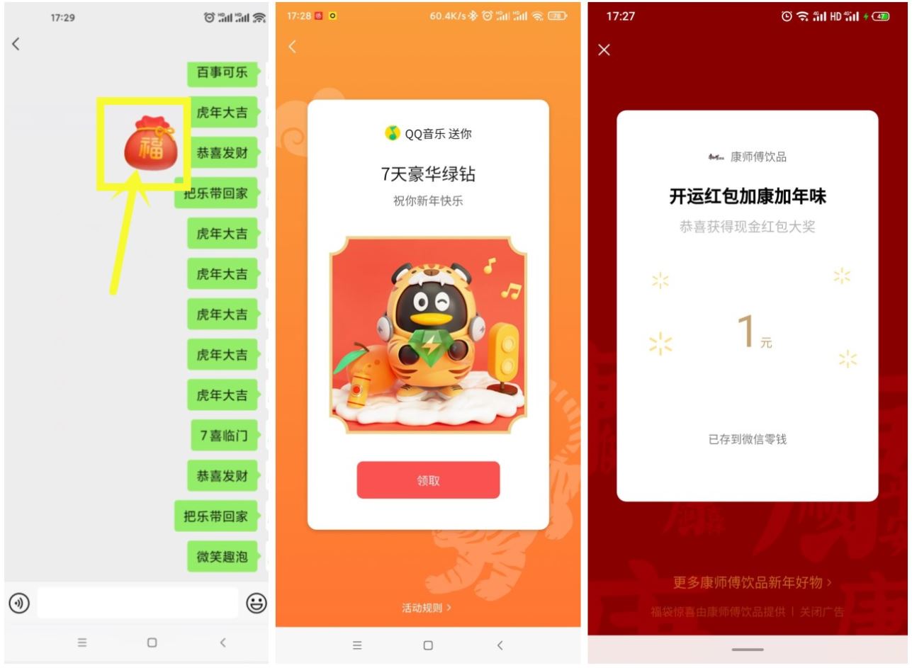 1、打开任意微信好友或者公众号->发送以下口令->点击掉落的福袋