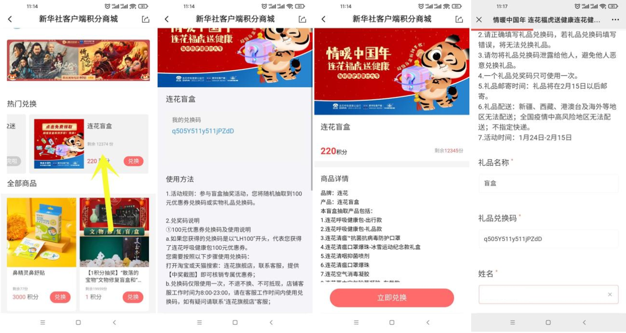 2、积分商城->热门兑换->莲花盲盒->兑换获取->如果是“LH100”开头的兑换码说明没中