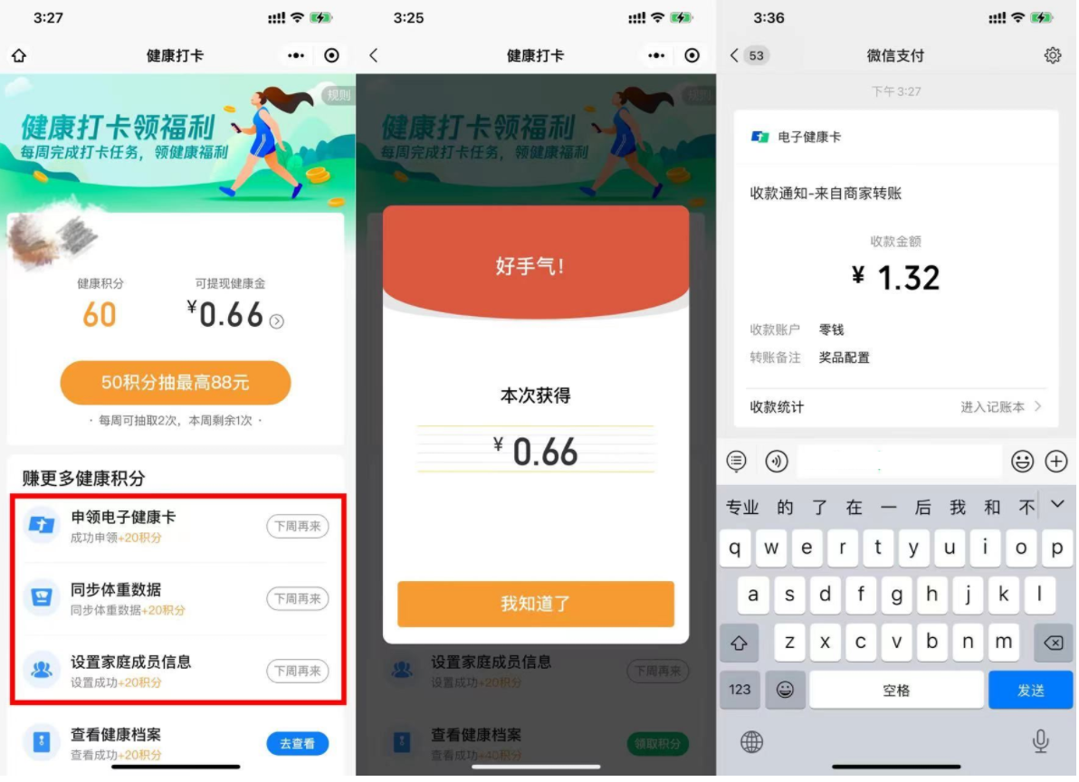 1、微信扫码活动1->选择首次申领健康卡->完成前三个任务->领取积分->抽随机红包