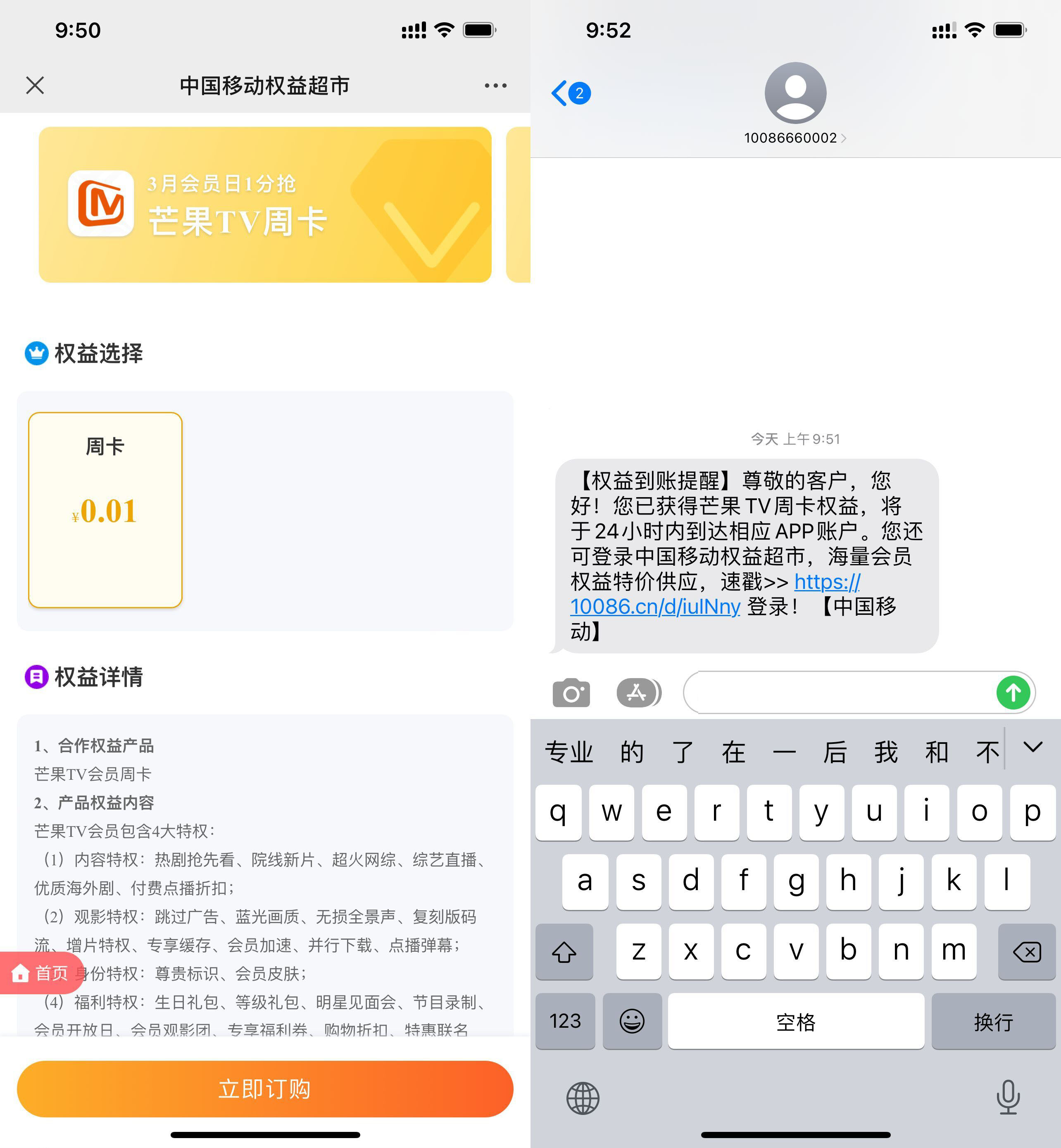 打开地址->使用话费支付0.01元->秒到芒果TV会员周卡->直充到账号