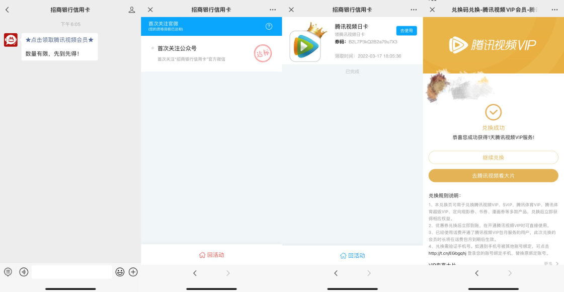 微信扫码关注->点击推文进入->领取腾讯视频会员天卡->复制兑换码->打开兑换地址兑换