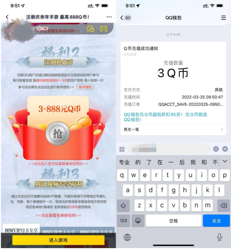 打开地址->跳转到腾讯视频APP->免下载秒玩->授权登录->返回下拉页面->抽取Q币秒到账
