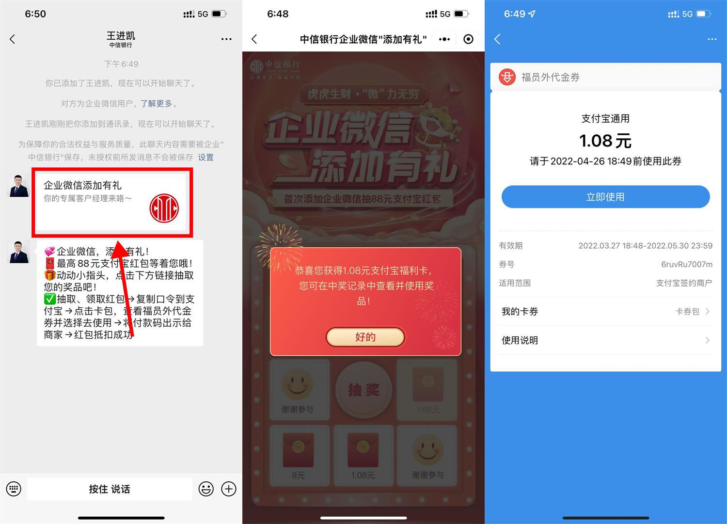 1、无需中信卡->微信打开扫码->添加好友->点击推文->授权登录->直接抽奖->基本必中1.08元红包