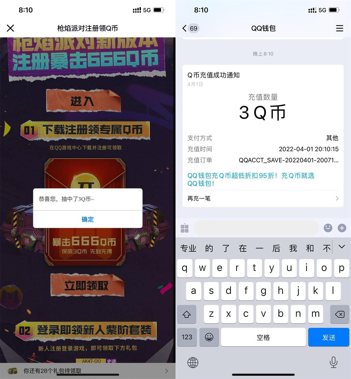 手机QQ打开->下载游戏->登陆注册游戏昵称->返回页面领3Q币