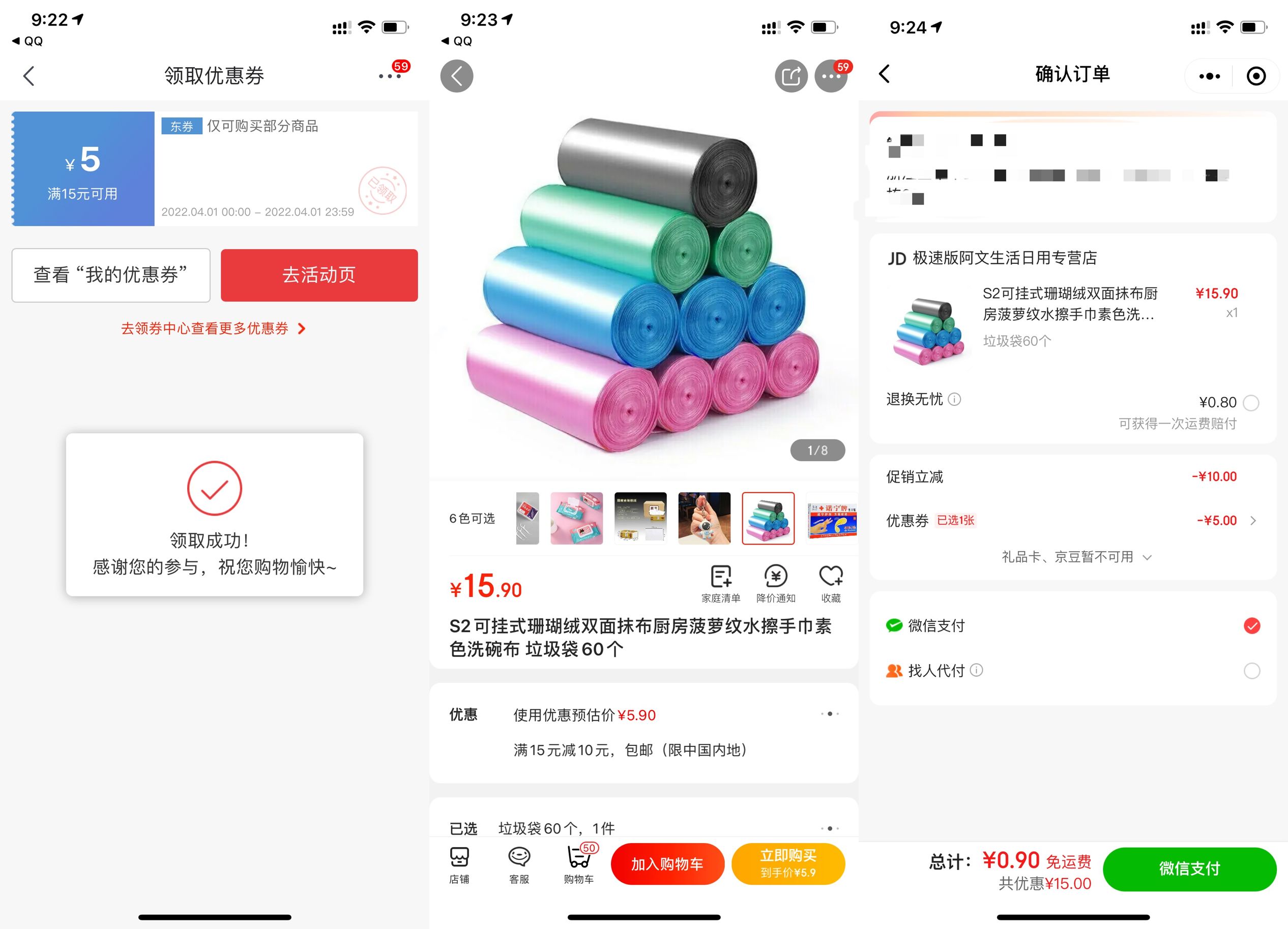 打开领券地址->领取京喜15-5元券->打开任意一个商品地址->加入购物车->打开微信小程序:京喜 ->底部“购物车”->结算下单