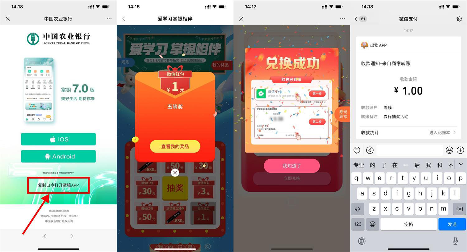 1、微信打开地址->底部“打开”->复制囗令->打开农业银行APP
