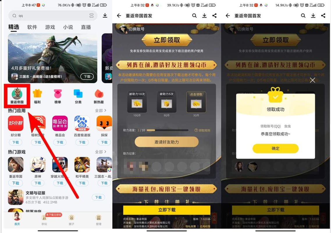 1、应用宝APP->首页“重返帝国”->下拉到“邀请好友注册领QB”