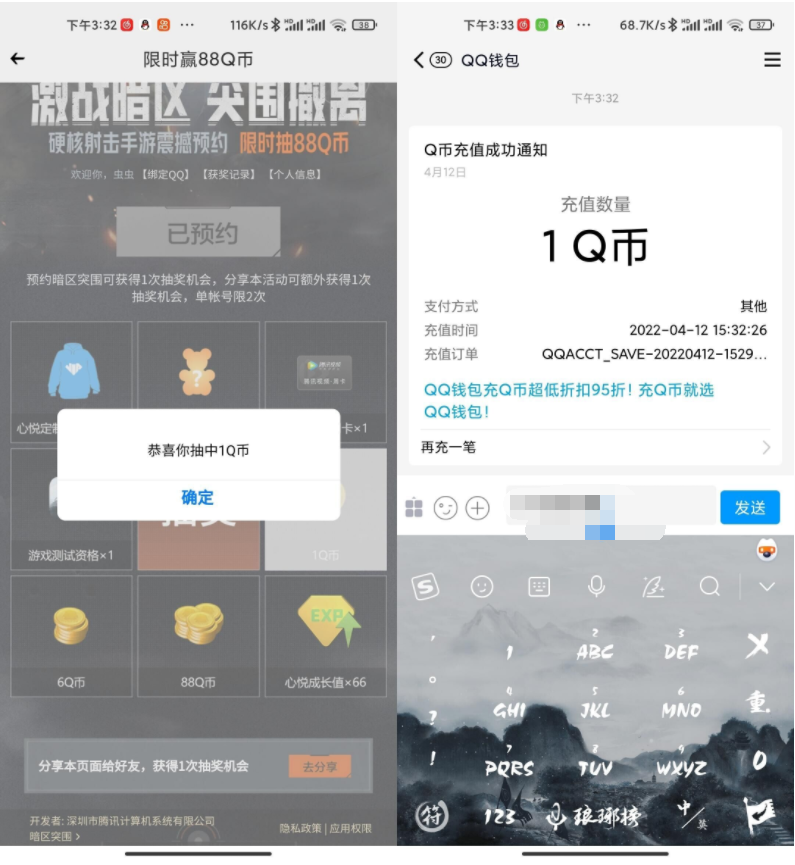 手机QQ打开->跳转到心悦俱乐部APP->预约、分享得两次抽奖机会->点击抽奖非必中