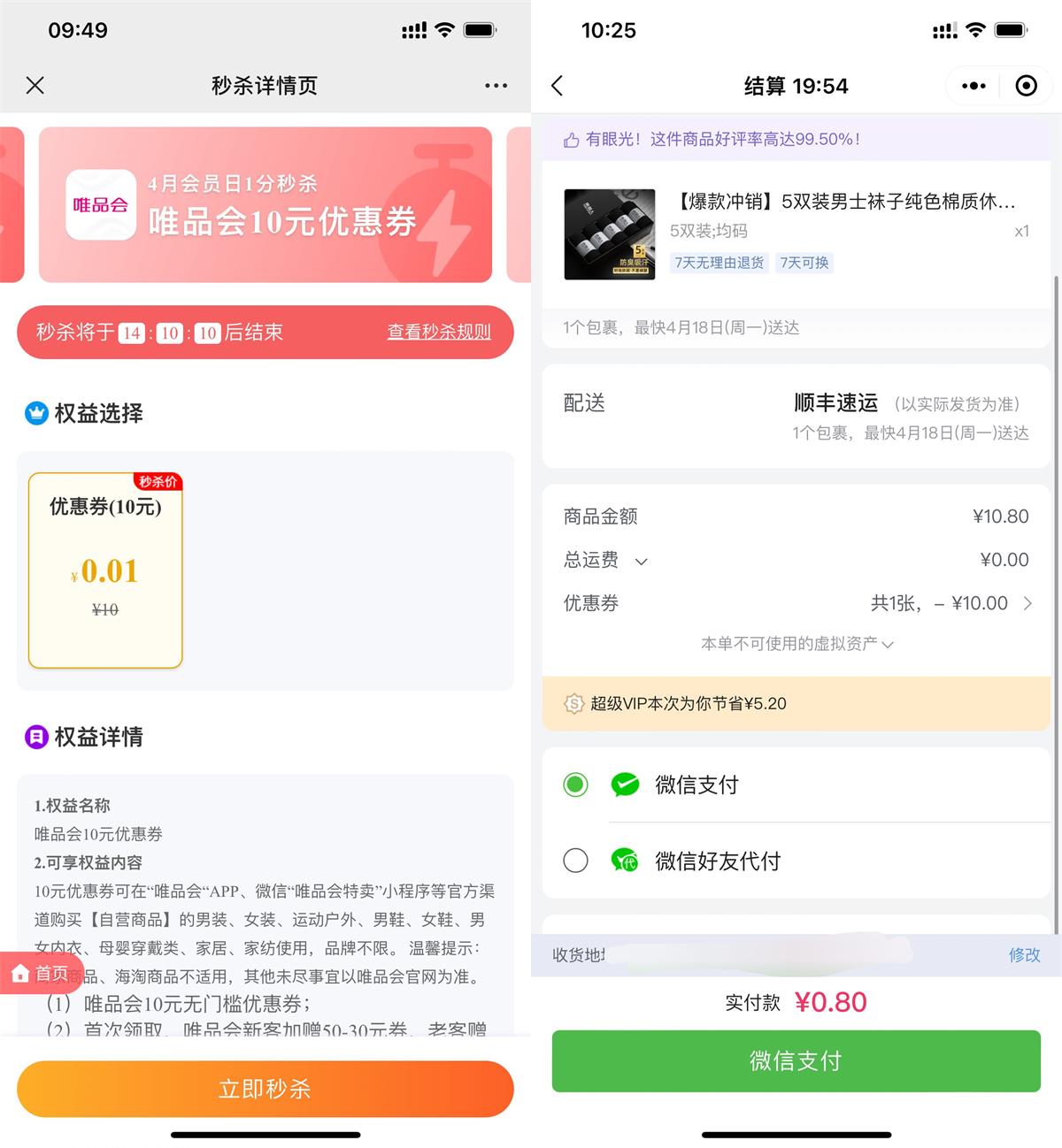 打开活动地址->支付0.01元话费->领取唯品会10元券->打开商品地址扫码进入->加入购物车->填写地址下单顺丰包邮
