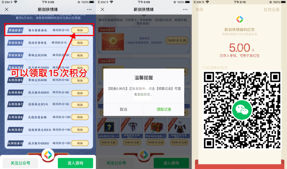 2、设置昵称->返回页面领取15次10积分->下拉页面使用150积分兑换5元红包