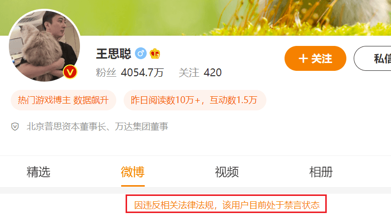 网传王思聪微博账号遭封禁“现已无法查看”具体原因尚未公布!