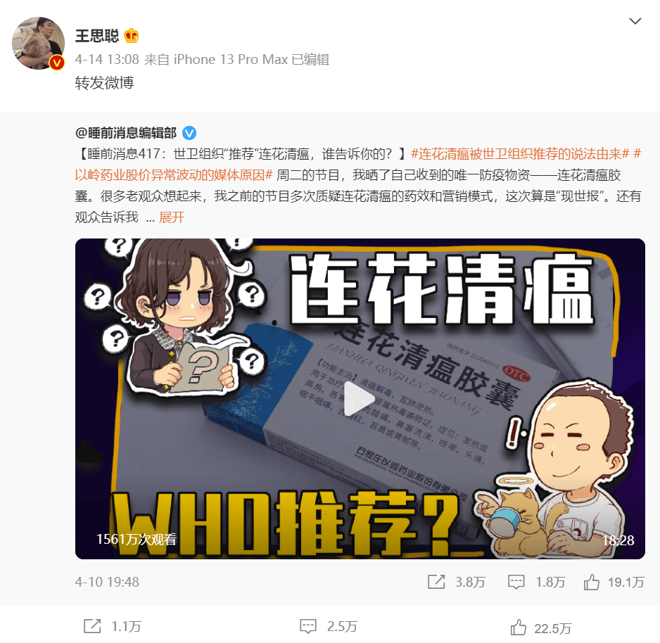 难道是因为4 月 14 日转发了一条质疑“世卫组织是否推荐连花清瘟”的视频微博?