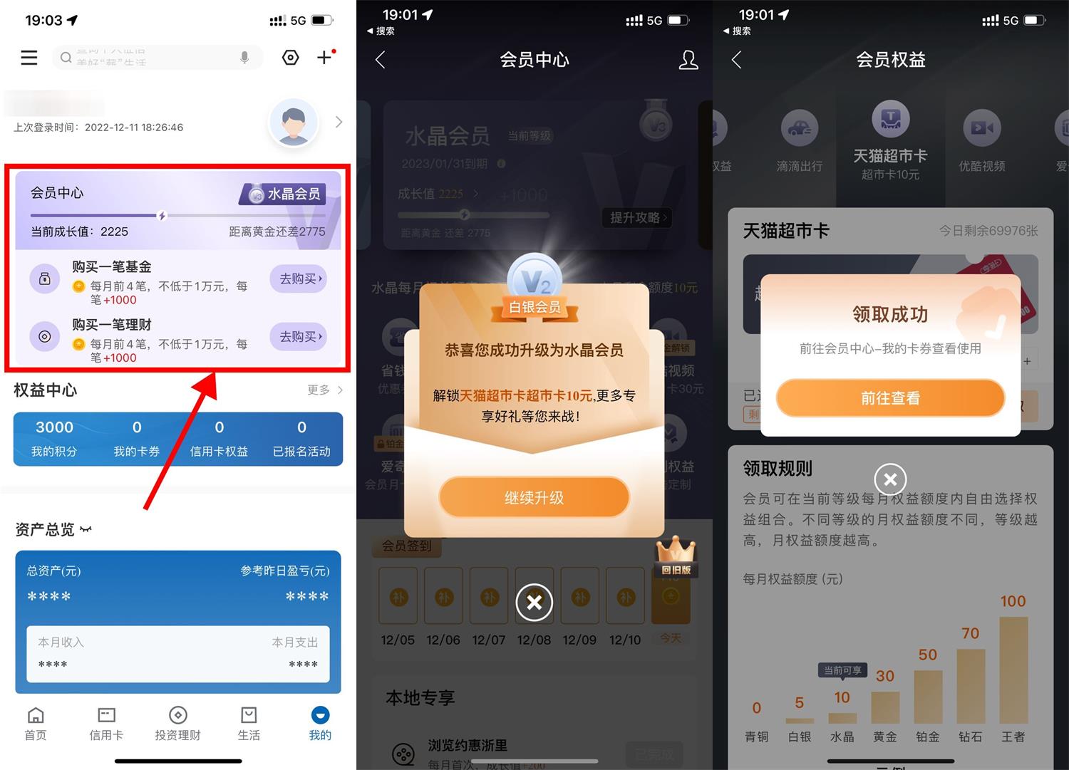 建行APP->我的->会员中心->完成简单浏览得成长值->成长值升级到水晶会员得10額度,兑换10元天猫超市卡,复制券码打开地址兑换