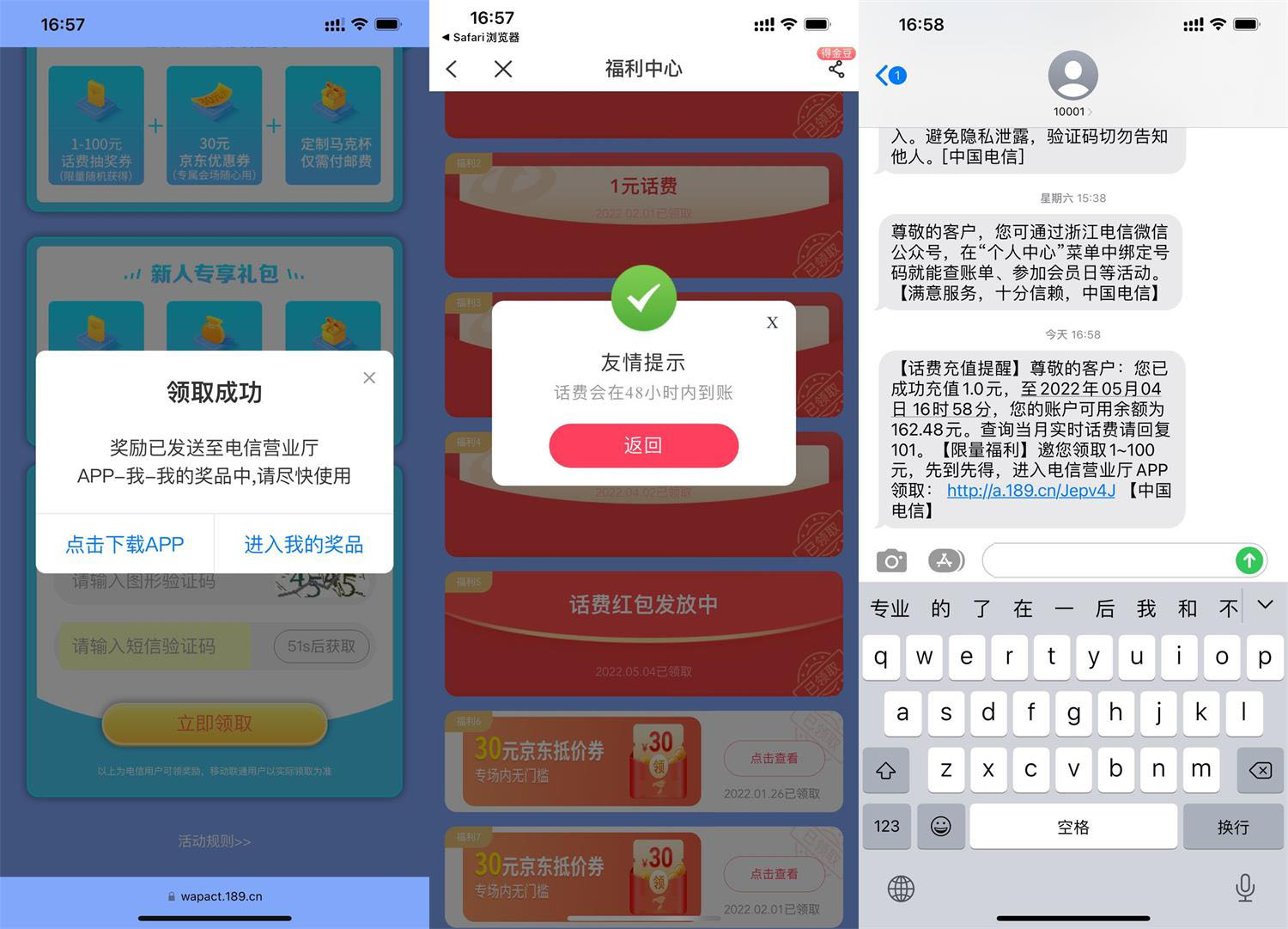 打开地址->输入手机号领取->根据提示跳转到电信APP->点击领取->抽1~100元话费