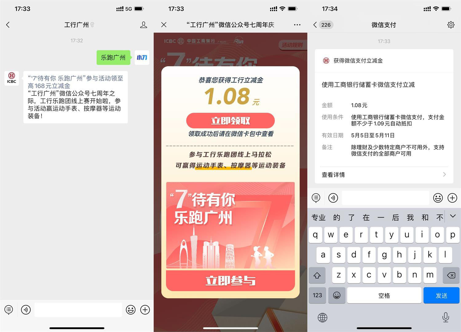 微信关注公众号“工行广州”->回复“乐跑广州”->点击推文进入->直接抽立减金