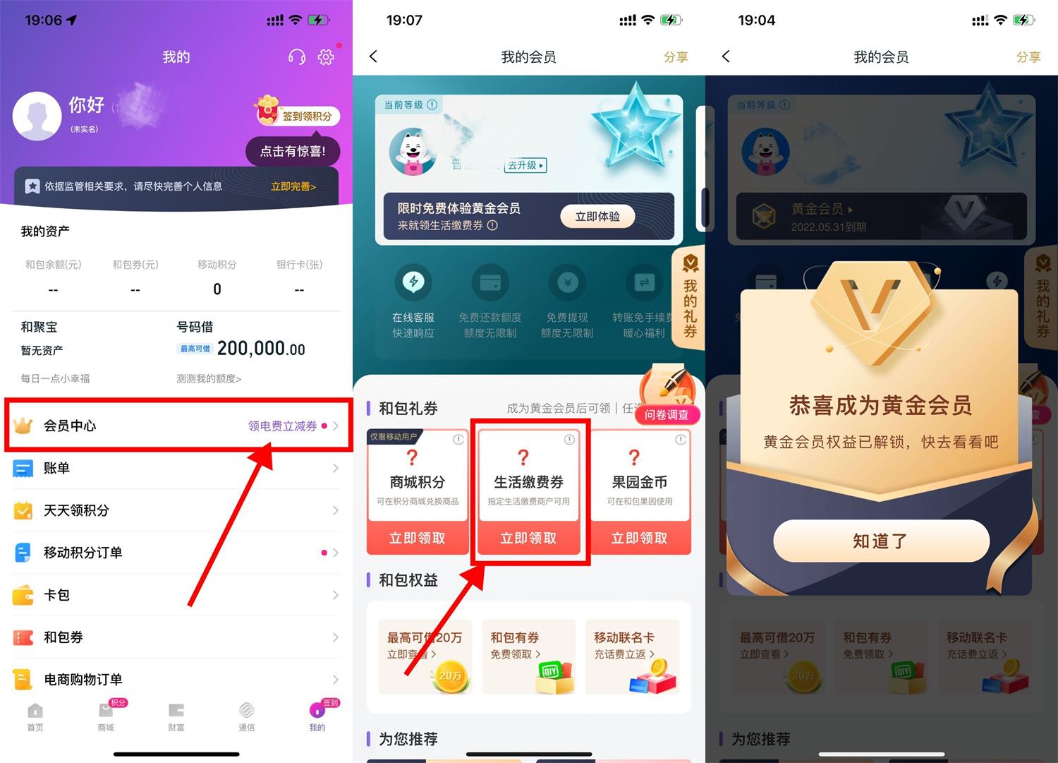 和包APP->我的->会员中心->立即体验黄金会员->自动领取2-1元生活缴费券->可1充2元水电费或通讯费