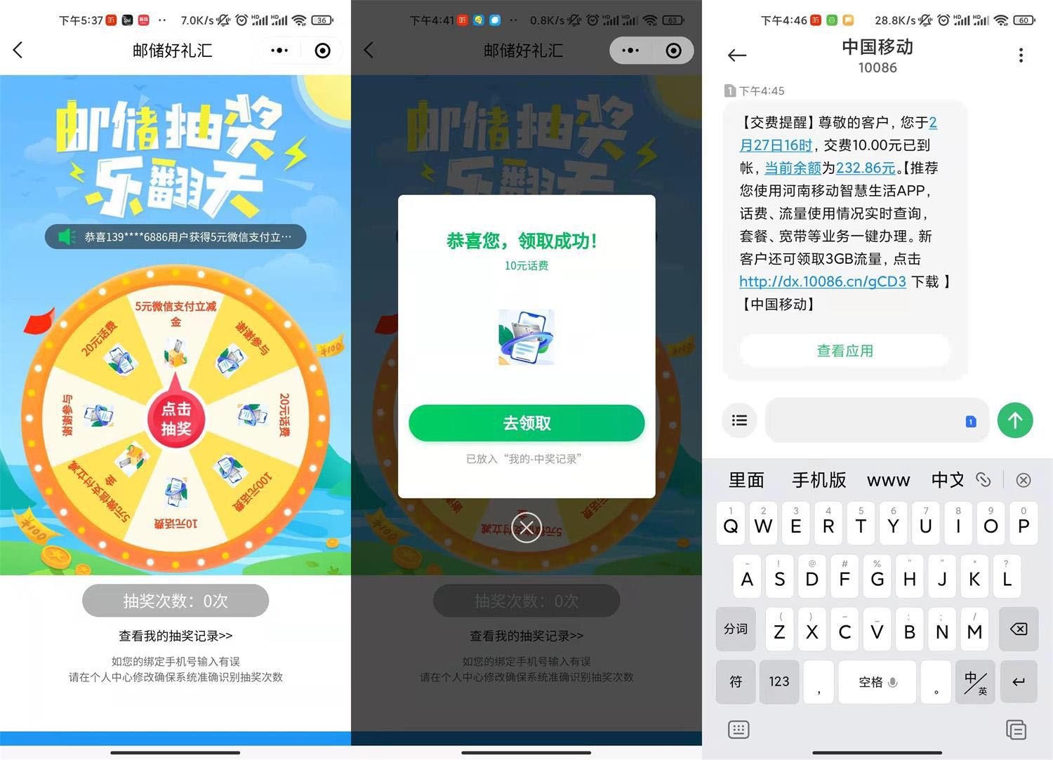 1、微信小程序搜索“邮储好礼汇”->点中间达标有礼进去抽奖->如果没机会就用邮政给微信充38元