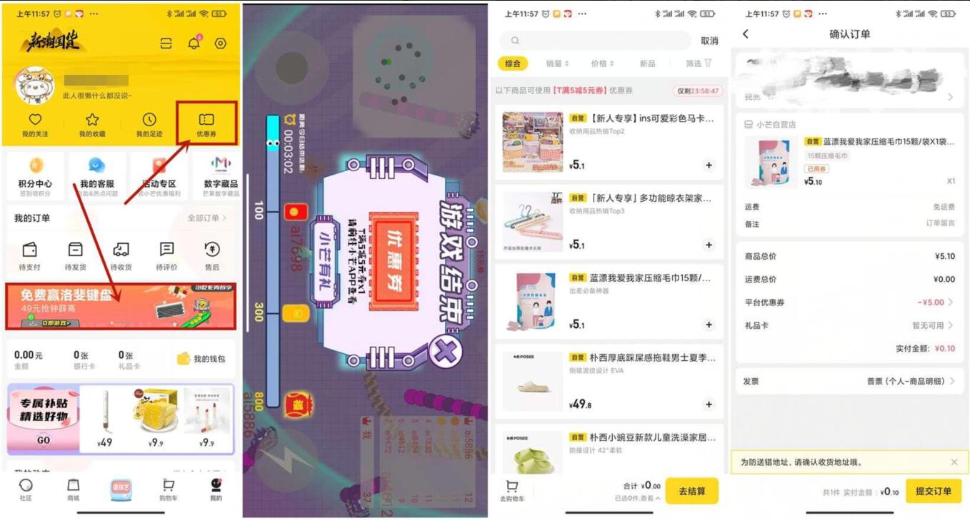 1、小芒APP->我的->横幅“免费赢洛斐键盘”->进入玩贪吃蛇游戏->达到积分自动领取满5减5元券