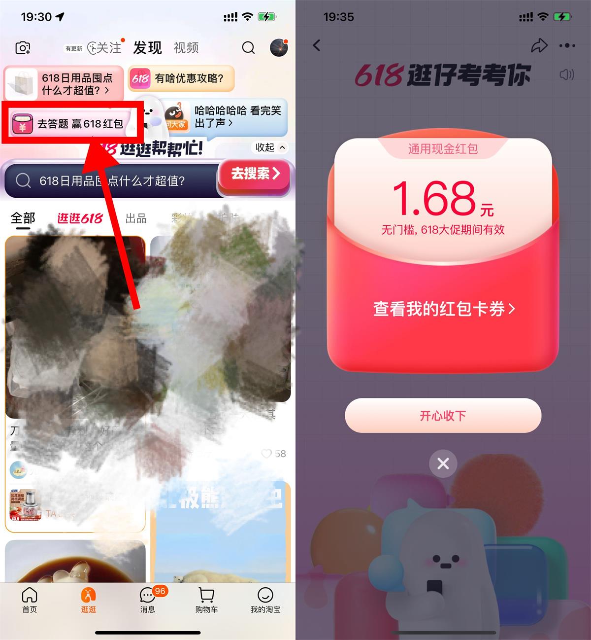 手机淘宝APP->底部“逛逛”->去答题赢618红包->答对10题抽红包