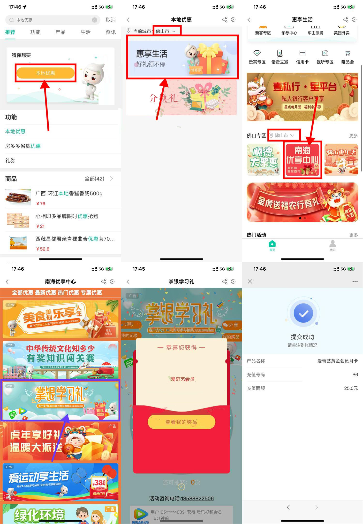 1、农业银行APP->搜索“本地优惠”->城市选择“广东-佛山”->惠享生活->城市再次选择“广东-佛山”