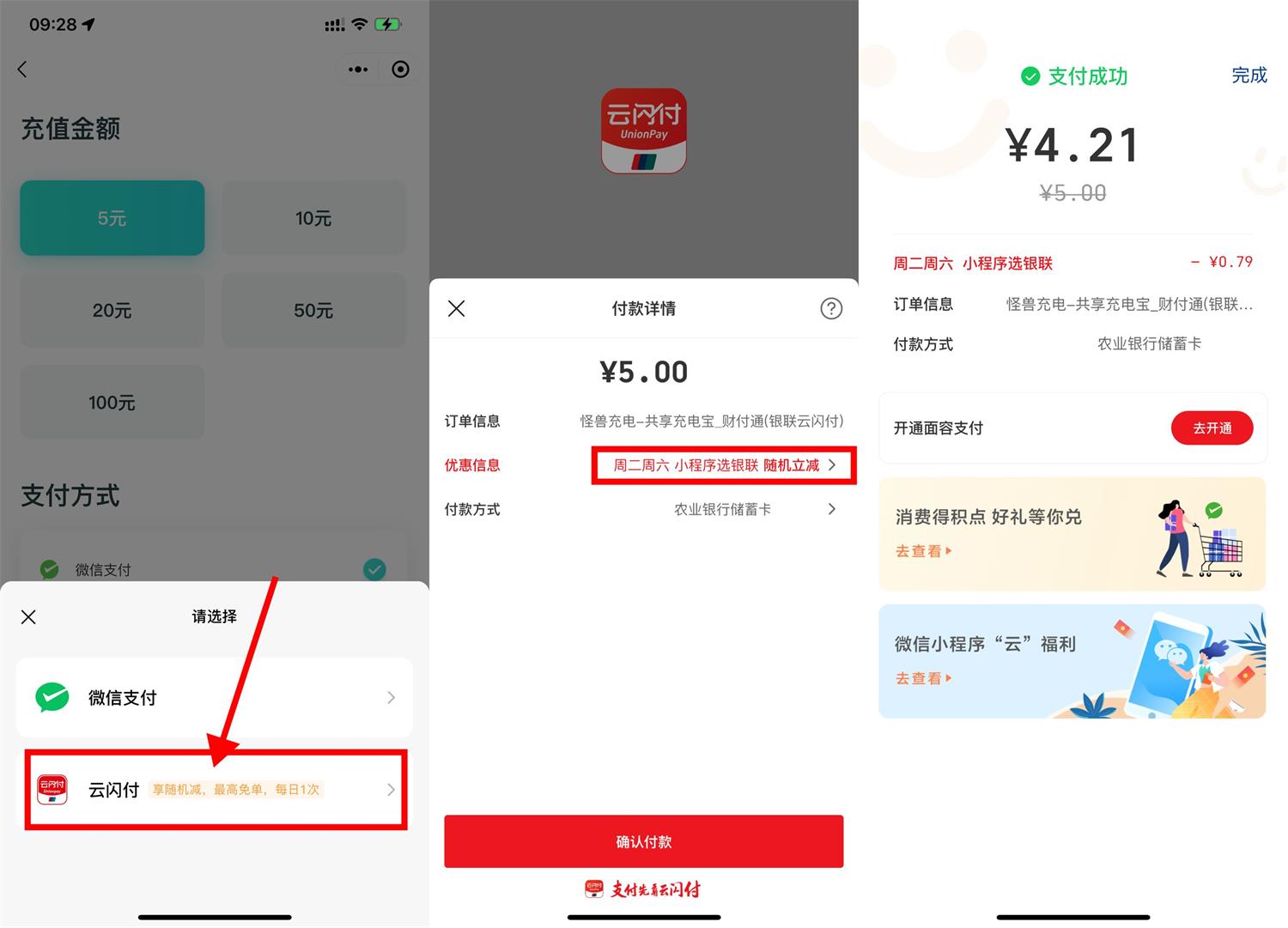 微信搜索小程序“怪兽充电”->使用云闪付充值5元->看见有“随机立减”就可以充->充完直接提秒到