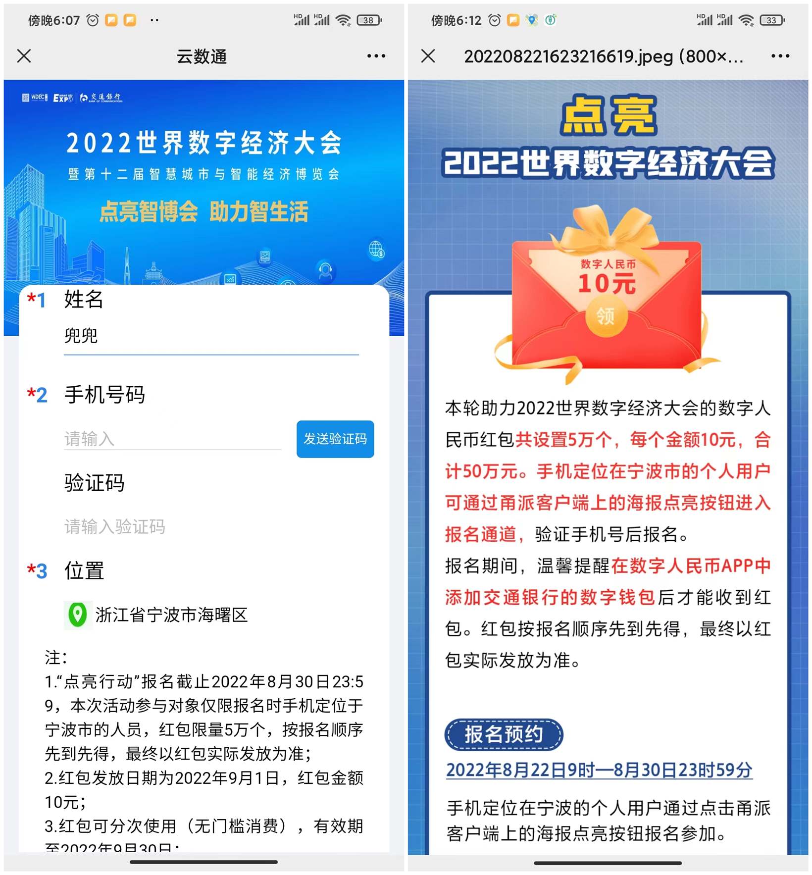 先定位宁波任意地区->再打开地址->填写姓名和手机号->提交报名即可->红包将于9月1日发放到数字人民币APP交行钱包内