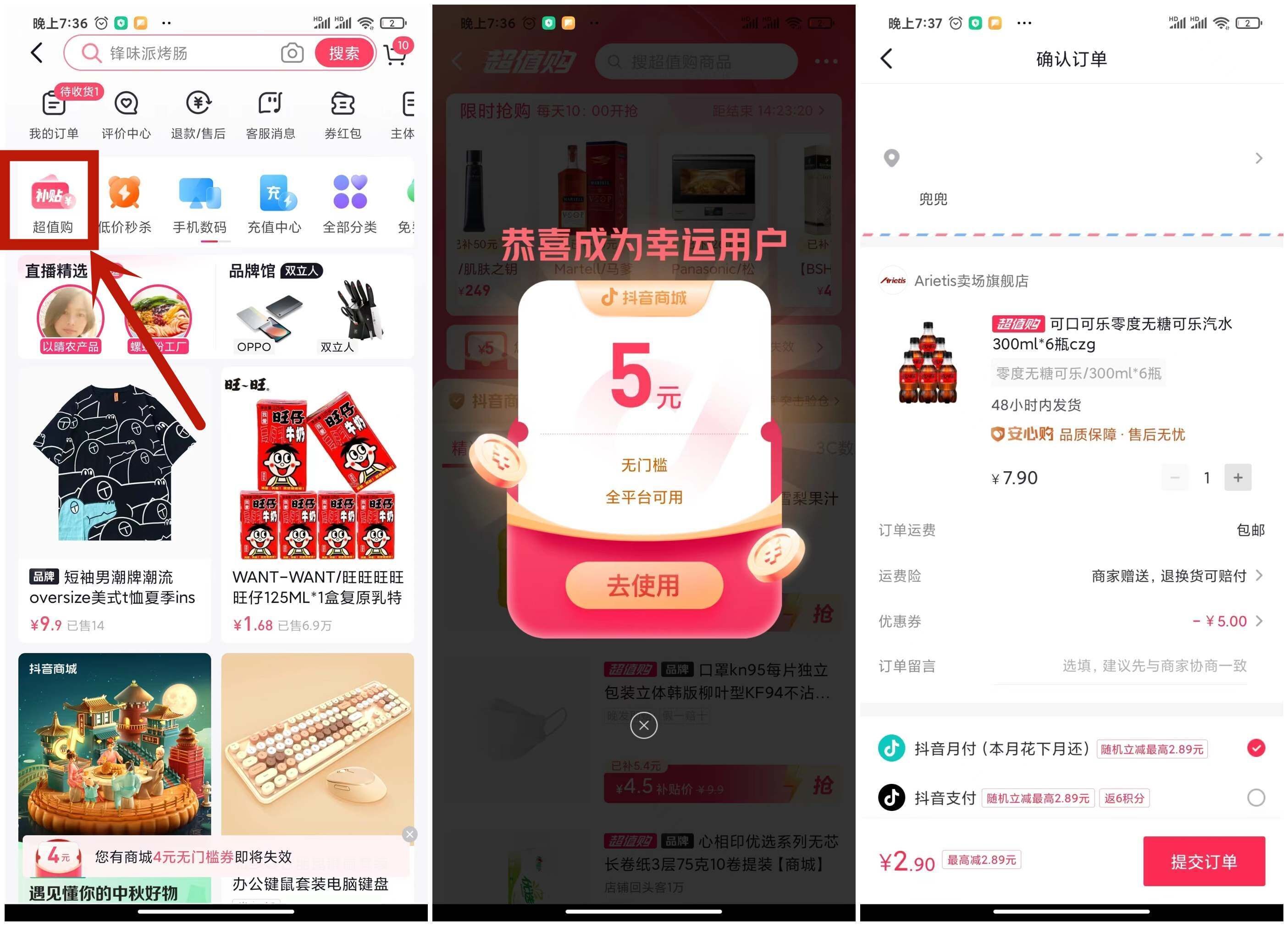 抖音APP->我的->抖音商城->进入“超值购”->自动弹出5元券->券购买食品或生鲜可用,可用找点低价的零食或饮料撸