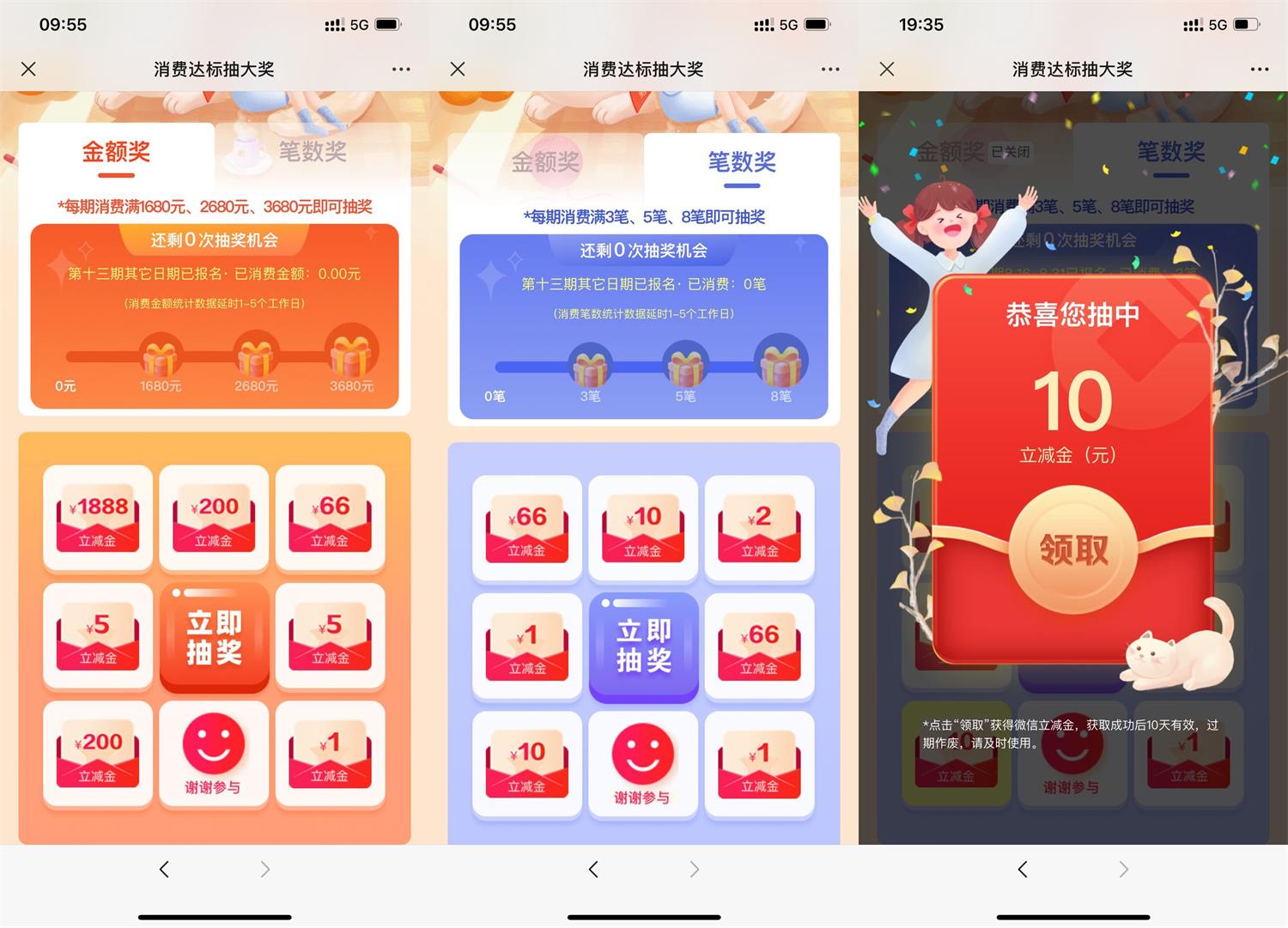 微信打开报名后->二选一得抽奖机会->第一种金额奖:达到指定消费金额即可抽->第二种简单:不限消费多少元->累计消费满3笔、5笔、8笔就可以抽