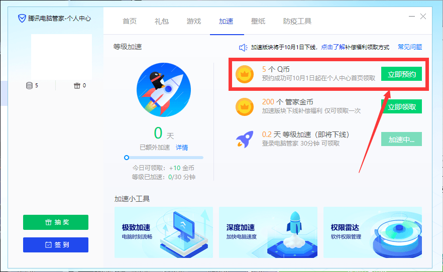 腾讯电脑管家->点击头像进入个人中心->加速->预约5Q币->等10月1日正式下架后直接兑换领取