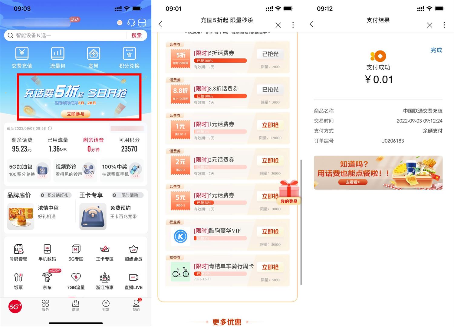 联通APP->首页横幅进入->进入直接抽3次->下拉页面根据页面时间点提示准点抢话费满减券或话费折扣券或酷狗音乐会员