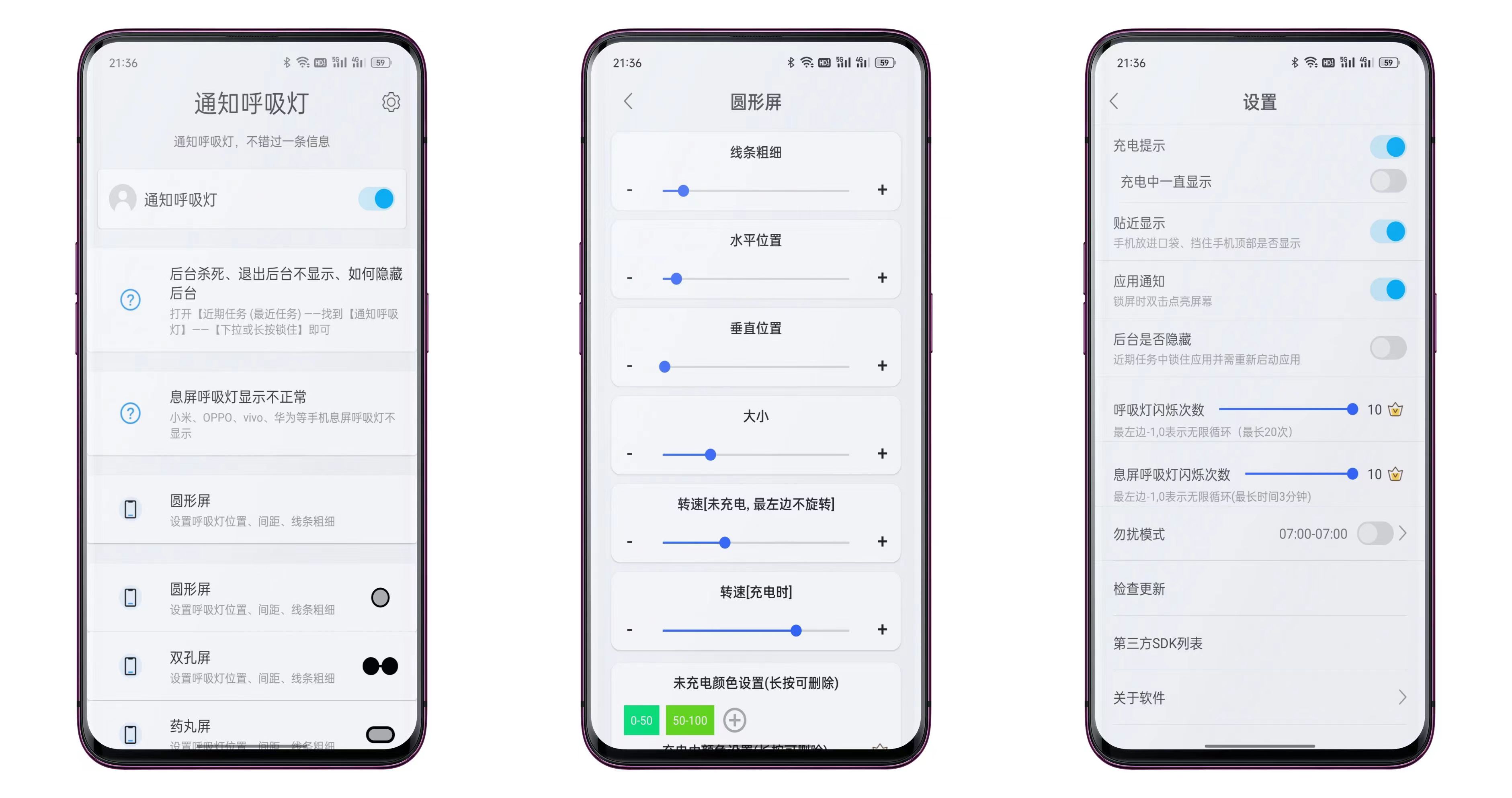 通知呼吸灯是一款可以让异性屏实现应用通知,通过呼吸灯的提醒,包括来电通知呼吸灯、短信通知呼吸灯、充电时呼吸灯提醒等。覆盖了市面上主流机型,圆形屏、双孔屏、药丸屏,异型屏手机用户福音