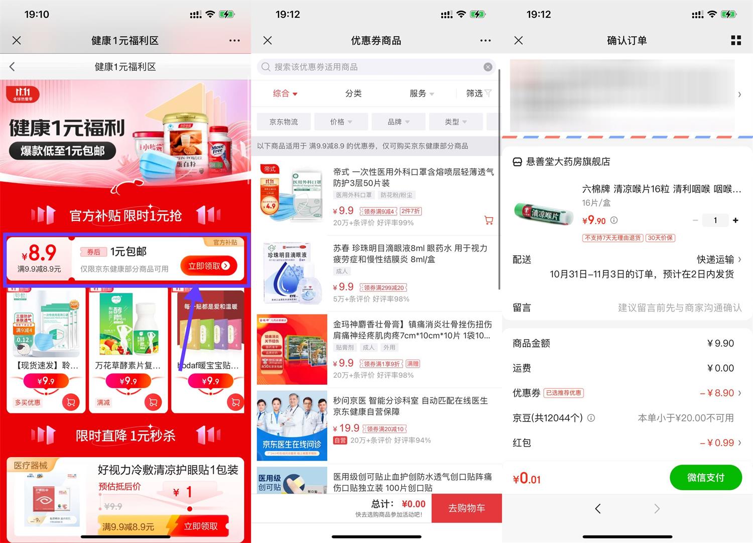 红包地址反复进入领3次红包->领券地址领取9.9减8.9券(下拉页面还有其他券)->选择自己想要的实物下单即可,抵扣红包最低0.01元到手