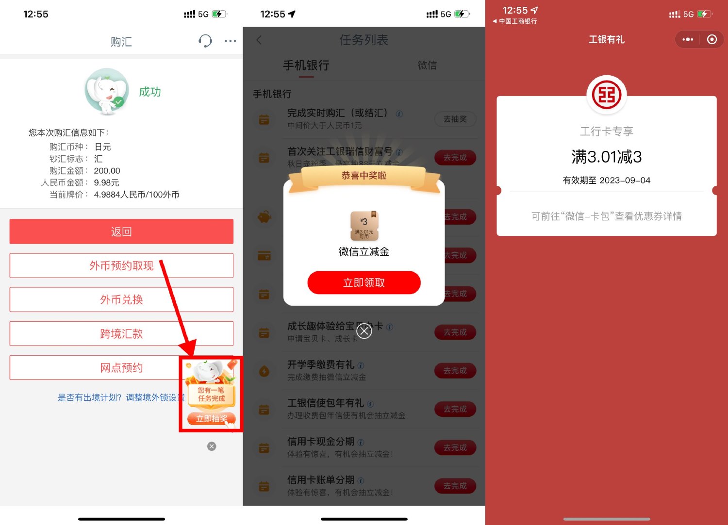 工行APP搜索“任务中心”->结售汇任务->选择买200曰元或2000韓元->右下角抽立减金->抽完之后搜索“结售汇”->再把曰/韓元卖掉即可(实际损失0.06元左右)
