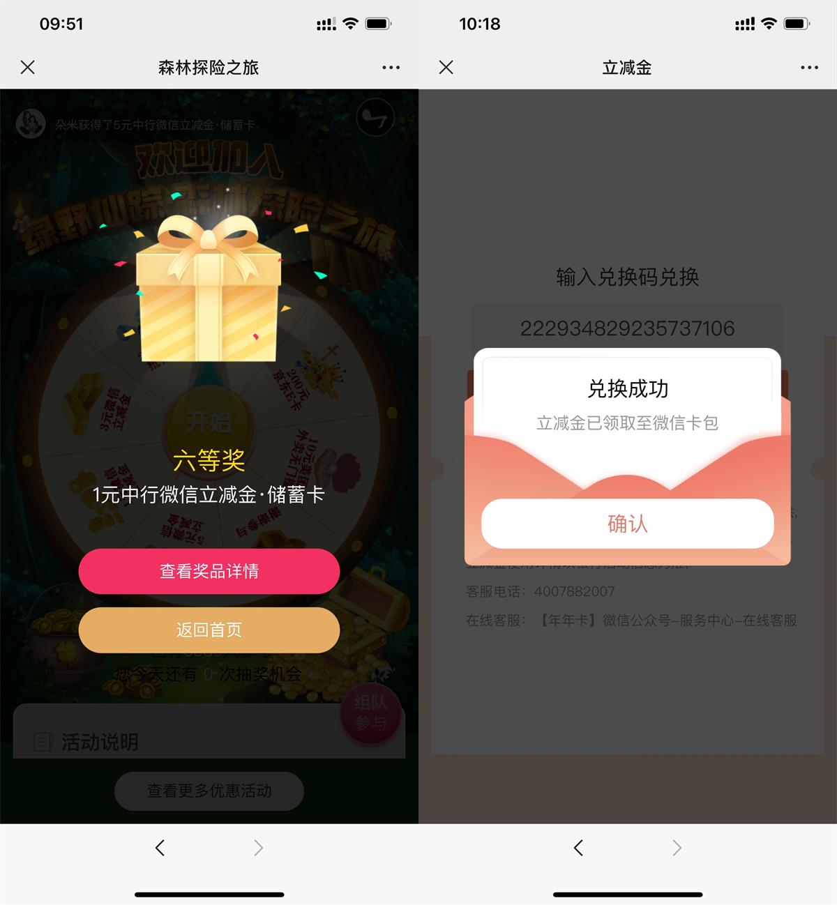 微信关注公众号“年年卡”->打开地址进入活动->默认有3次机会,组队额外得3次机会->抽中立减金复制兑换码兑换
