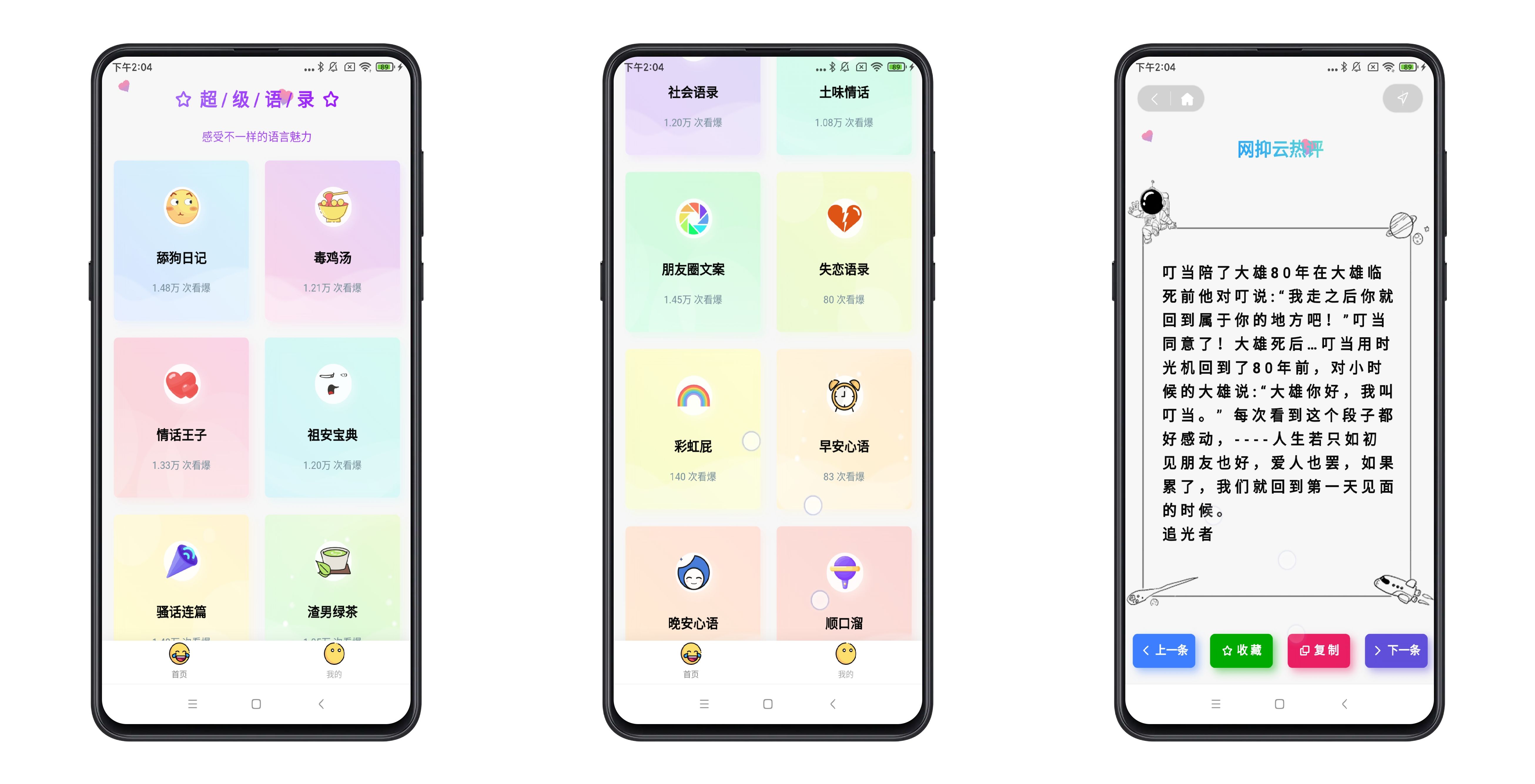 超级语录是一款包含舔狗日记、土味情话、精神语录、网易云评、奇葩对话、毒鸡汤、朋友圈文案、动漫语录、漫画语录、游戏语录、经典文学、网络热评、影视台词、诗词歌赋、人数哲理等等21个场景的App,送给爱聊天的你。
