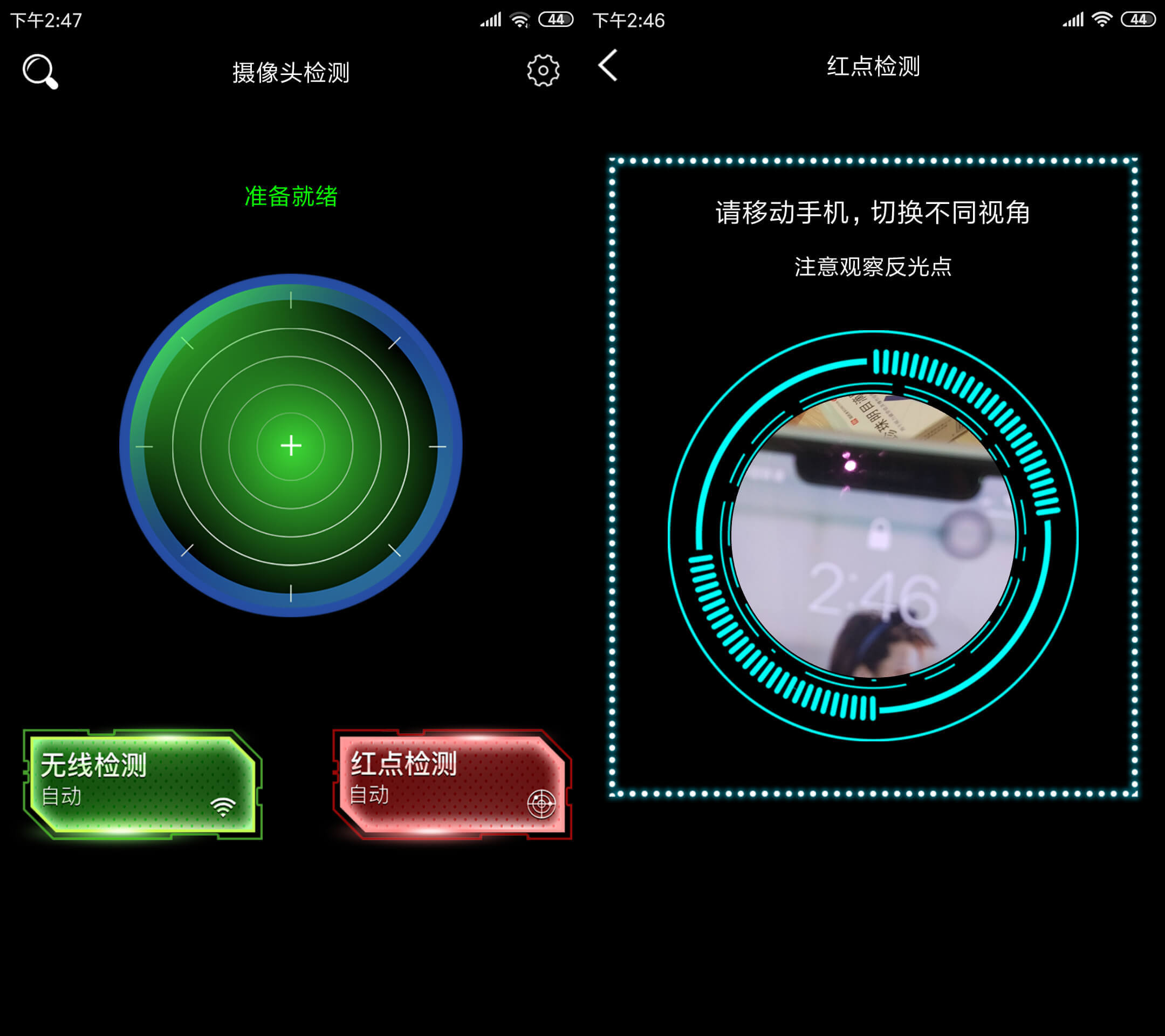 针孔探测器是一款安卓手机智能扫描检测所处环境摄像头的工具,能够帮助用户一键进行扫描,查询附近的摄像头安装情况,拥有无线检测和红点检测,支持自动选择不同的检测方式,帮助用户快速找出各种样式的摄像头,出行在外更安全,使用方法简单(解锁VIP)