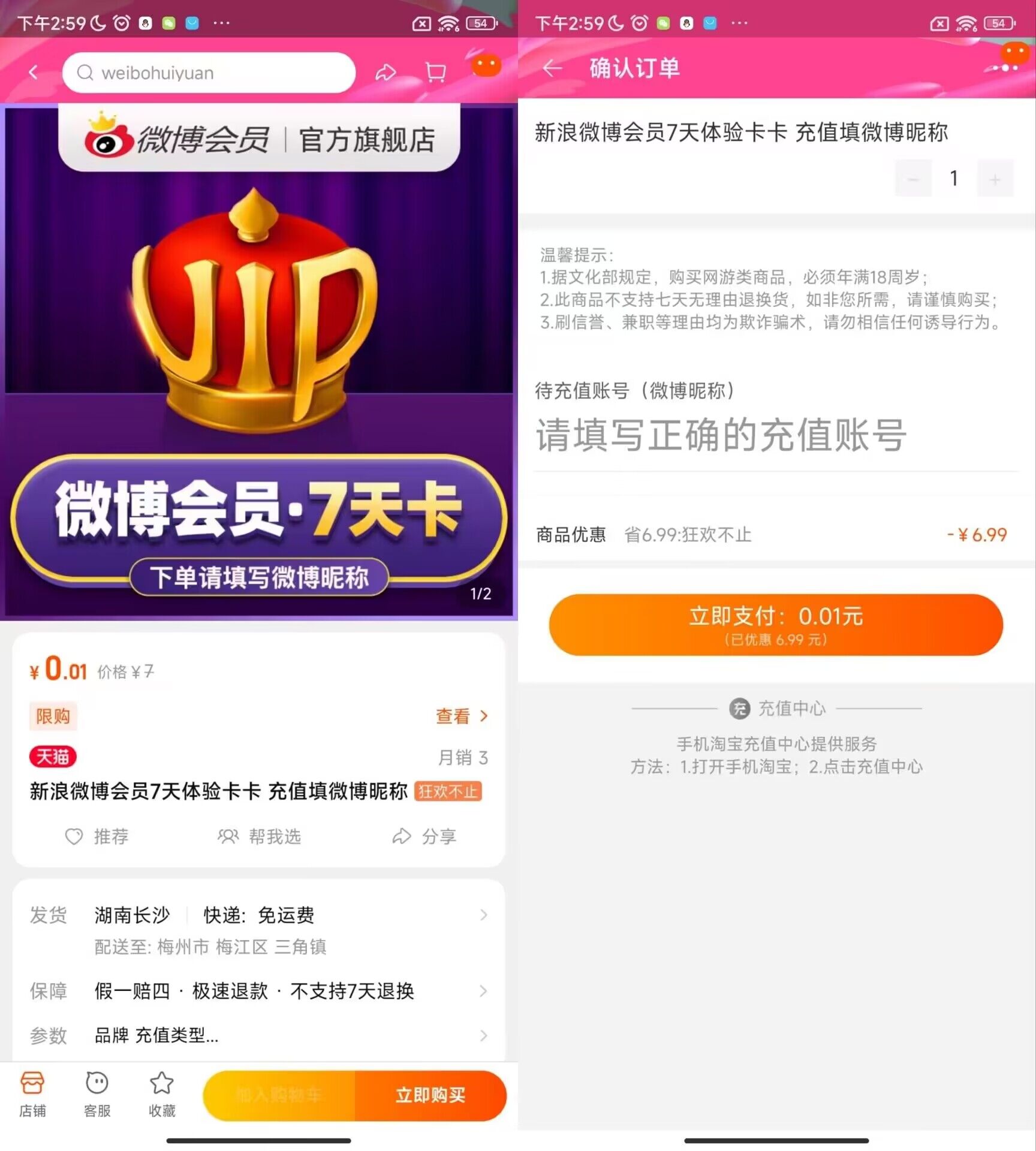 淘宝0.01元开7天微博会员