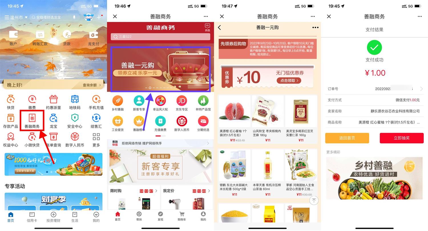 建行APP搜索“善融商务”进入->横幅“善融一元购”->领取10元无门槛券->任选11元的商品抵扣券后1元包邮到手