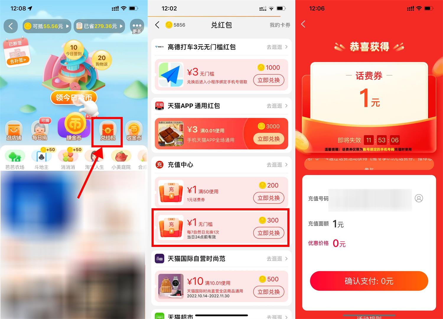 淘宝APP首页“淘金币”->兑红包->下拉使用300淘金币兑换1元话费券,直接使用秒到