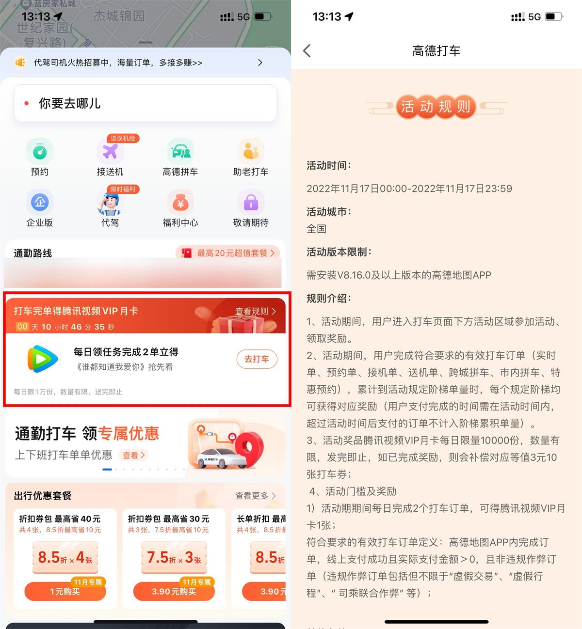 高德地图APP->打车->下拉领下任务->今日打车满2次领腾讯视频会员月卡,每天限量1万份