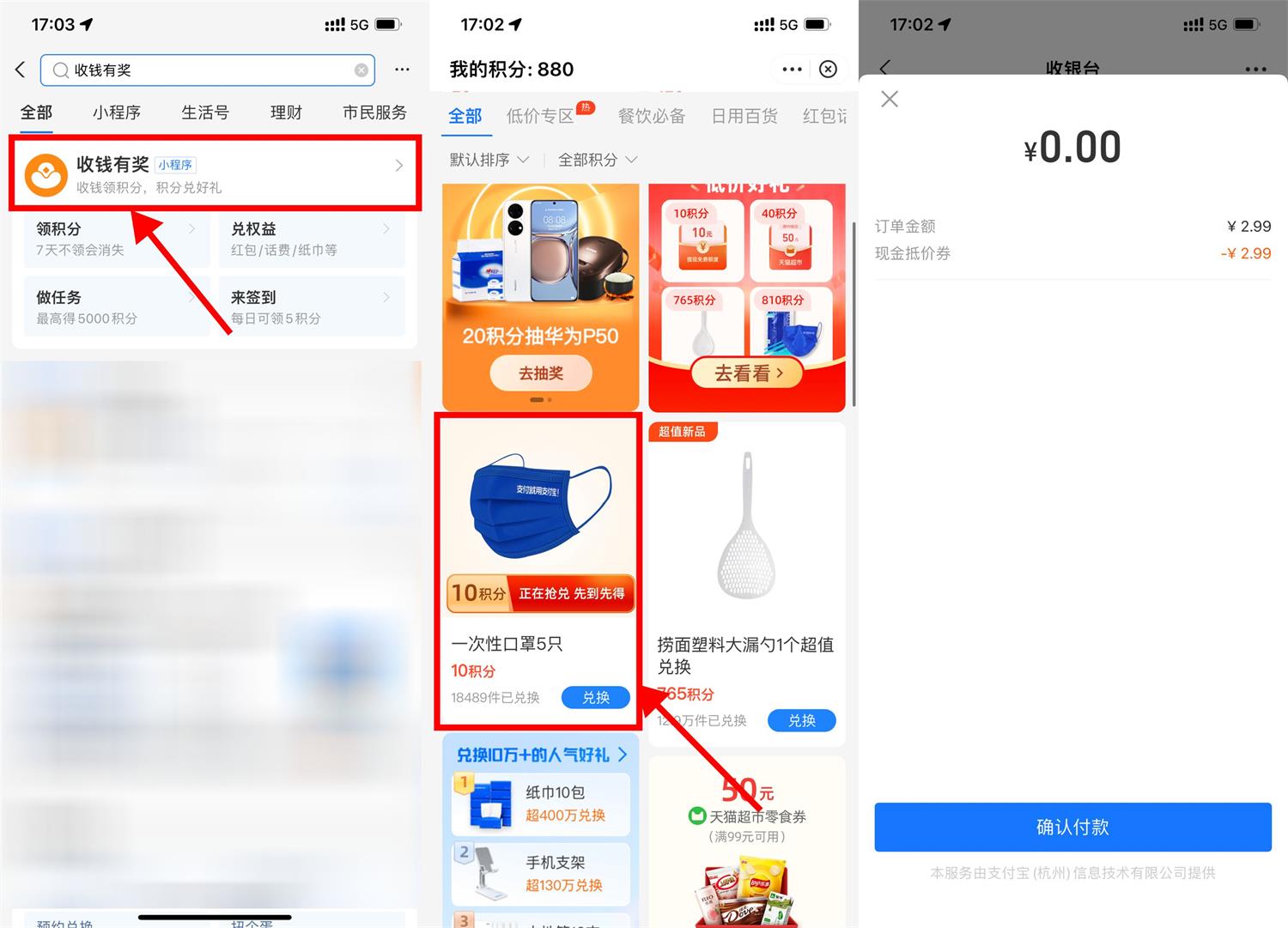 支付宝搜索“收钱有奖”->点小程序进入->下拉找到“一次性口罩5只 10积分”->用10积分兑换0元下单即可!