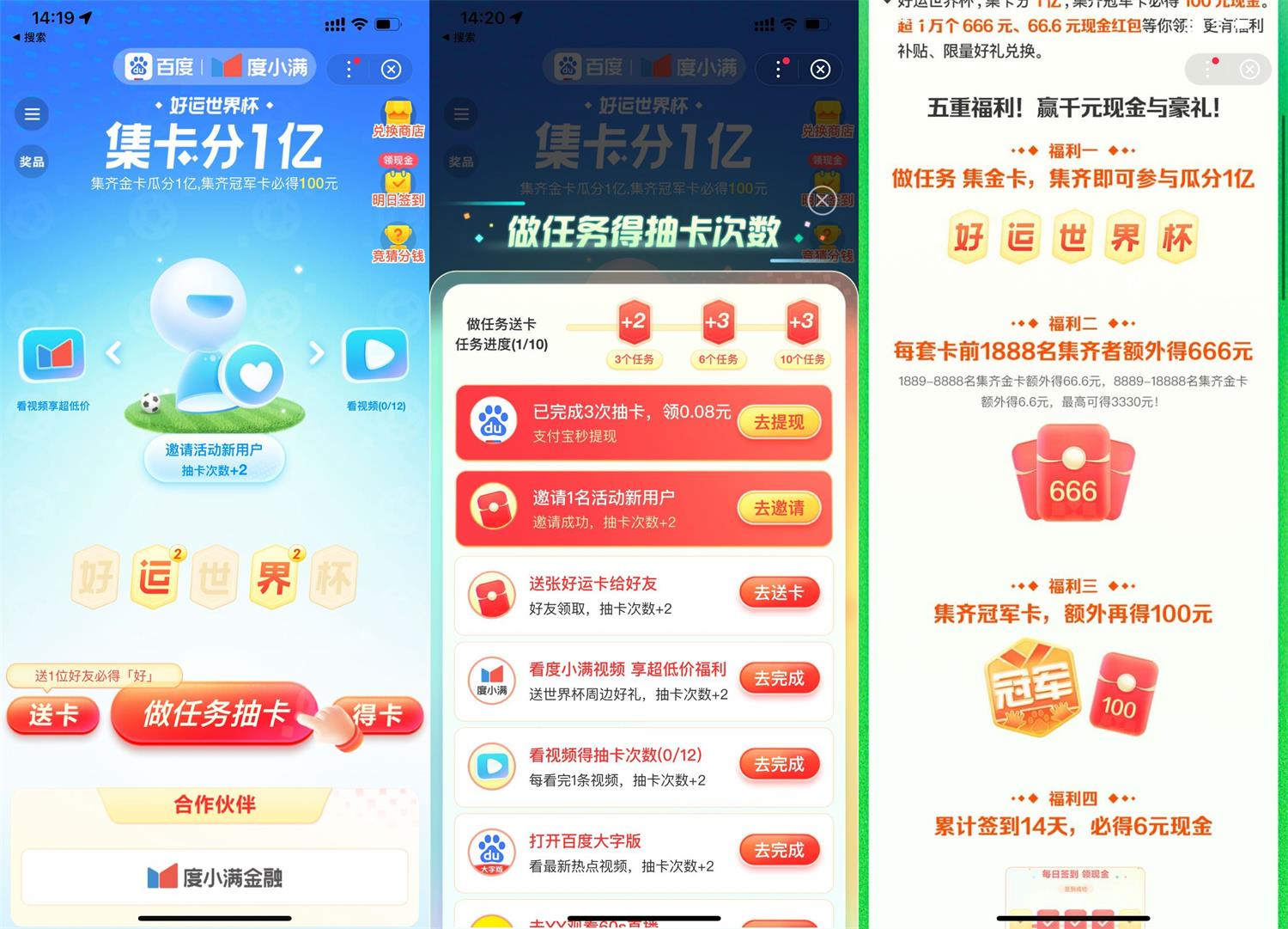 1、百度APP搜索“世界杯集卡”进入小程序->累计签到8/11天分别得3元红包,共6元