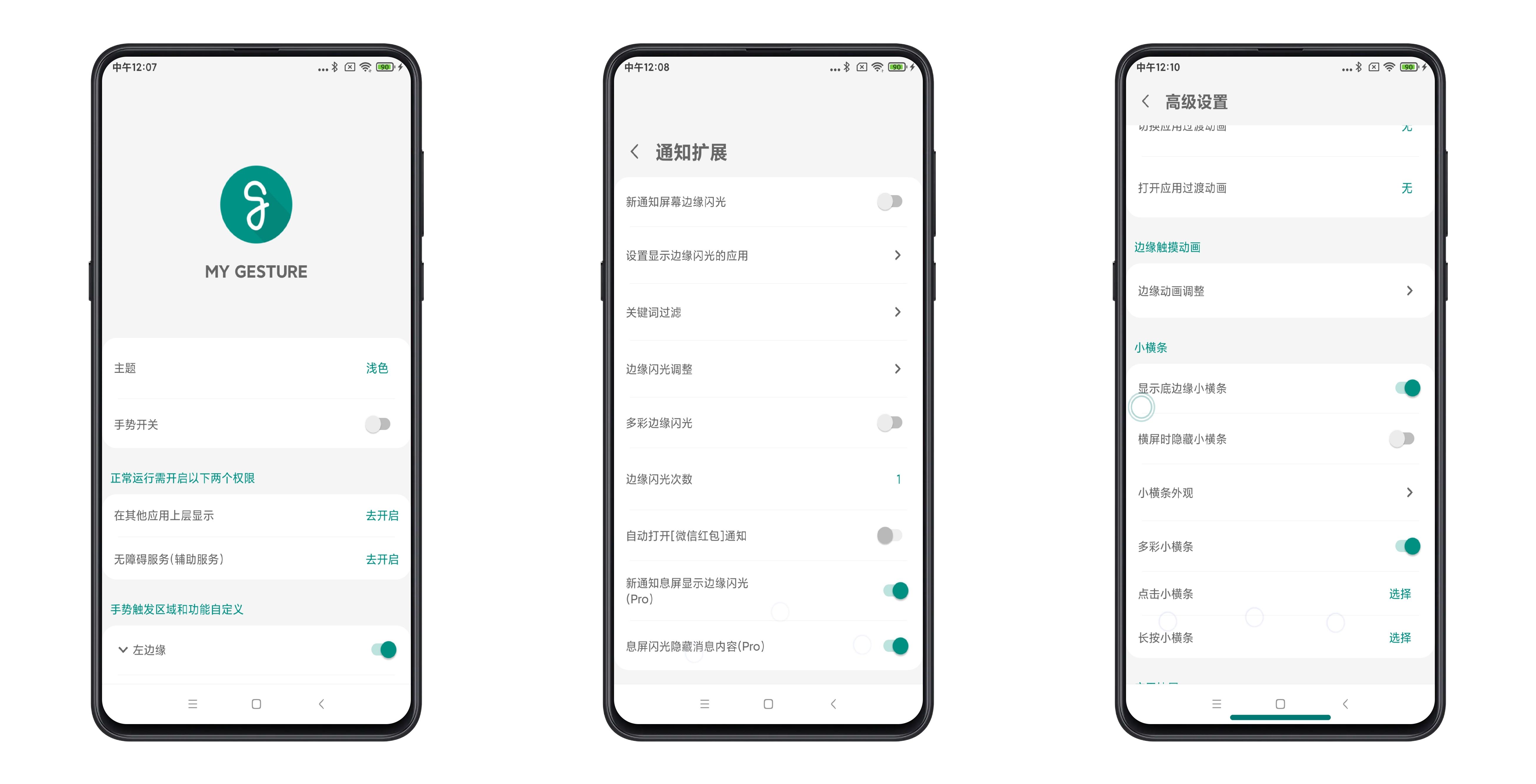 MyGesture是一款非常小巧、快速,且占用内存小的全面屏手势软件,麻雀虽小五脏俱全,虽然这款应用软件的大小仅有800KB左右,但功能却依然非常强大。支持左边缘上滑、左边缘下滑、左边缘长按并右滑、左边缘长按并上滑、左边缘长按并下滑等众多手势。另外,MyGesture的可自定义性超强,比如边缘触摸动画、边缘彩色光效、避免遮挡输入法(这个实用,避免了尤其底边缘区域屏幕出现“不灵敏”的现象)、兼容home键等。已经为大家解锁Pro版本所有功能!