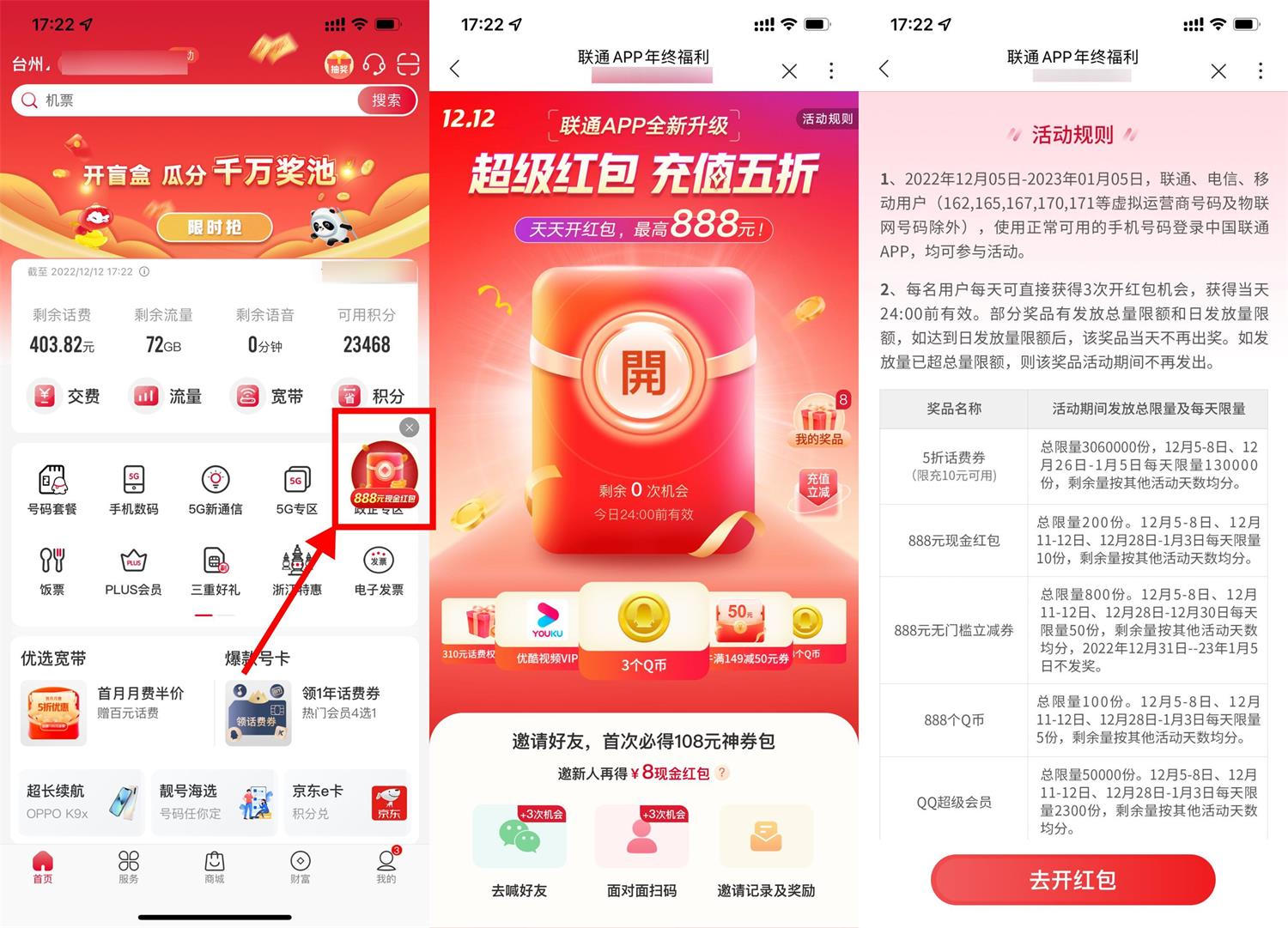通APP首页横幅进入->每天有3次机会->抽视频会员月卡、3~888Q币、以及无门槛和5折话费券->活动延期到1月5日结束