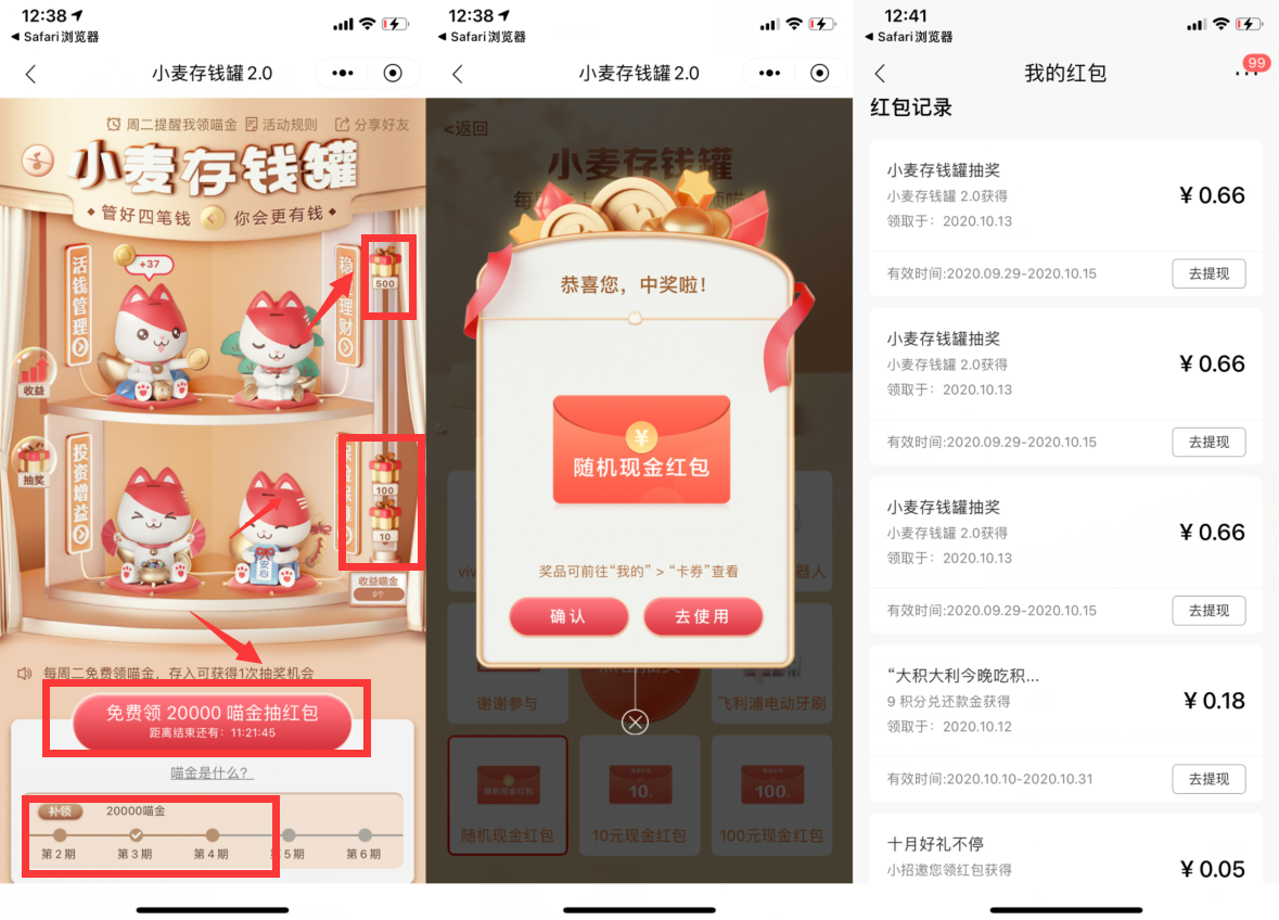 手机浏览器打开随便点击->跳转到招商银行APP参加->随便点个存钱罐立即存入抽奖->抽完后返回再点右侧边上下所有小礼盒继续抽奖