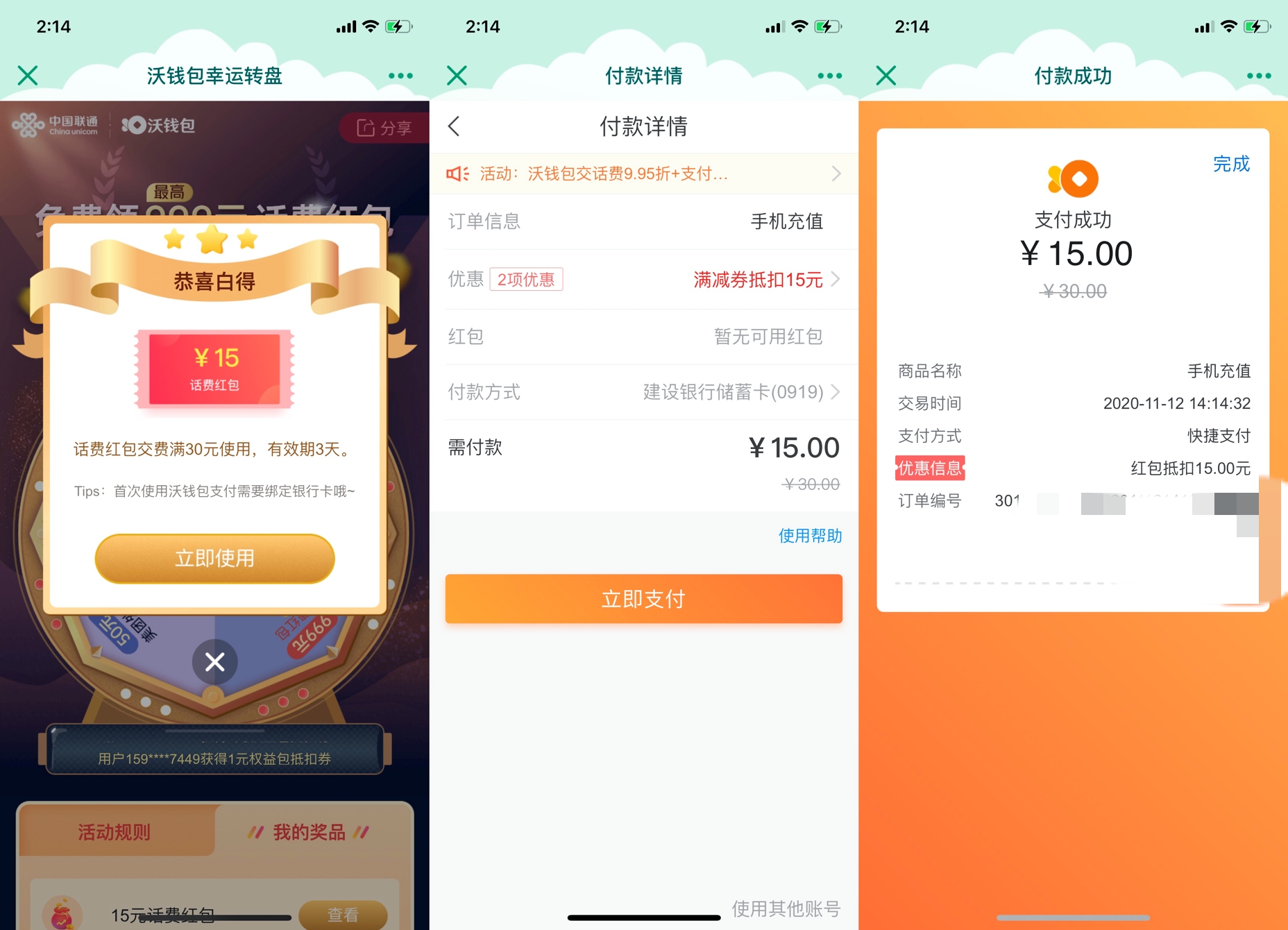 打开地址抽奖->只中1元没用 中15后下载沃钱包APP->简单绑卡充话费即可->移动电信也能参加->但只能给联通充话费!号多可以多充,可以用同一个实名!