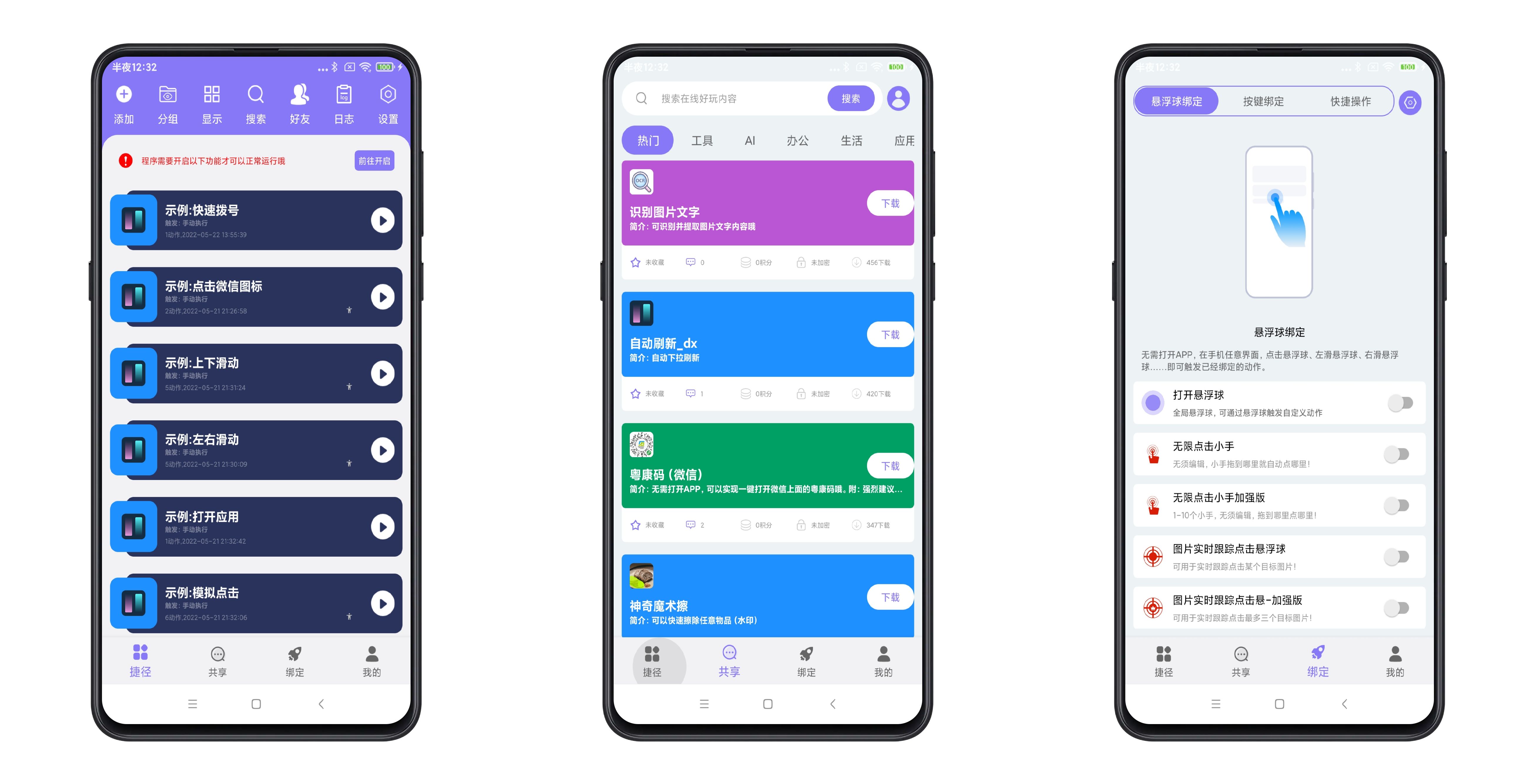 捷径助手,一款致力于为客户简单化手机上操作,提升手机使用效率,保持全部作用“一键直通”高效专用工具APP。也就是说,手机上全部繁杂的操作,都可以组成一个“作用通道”,客户只需点击一下快捷方式图标或是视频语音下达命令就可以实现这个功能。如:一键打开朋友圈、一键搜集蚂蚁森林能量水平、一键打开蓝牙并播放歌曲等。已解锁会员功能!